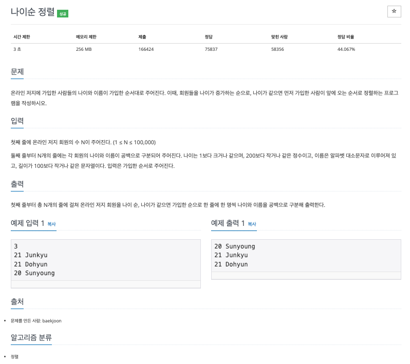 따라서 나이가 같으면 처음 입력된 순서대로 나열된다.