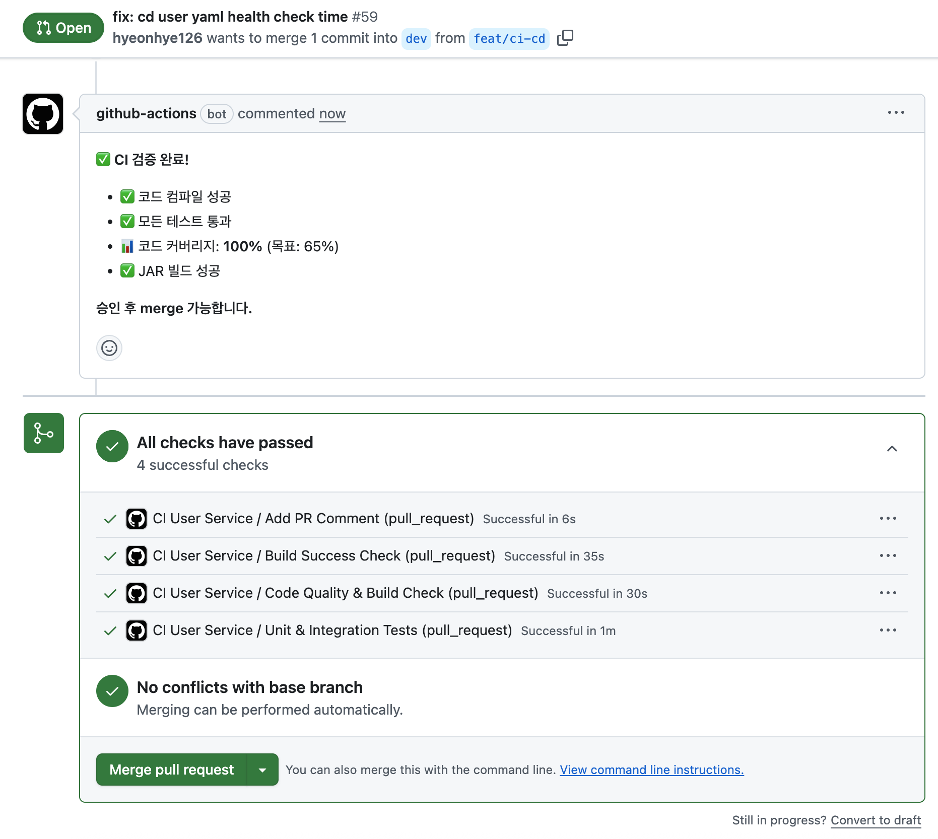 모든 체크가 통과되면 GitHub PR 화면에 "All checks have passed"가 표시되고, merge 버튼이 활성화된다.